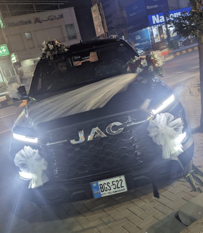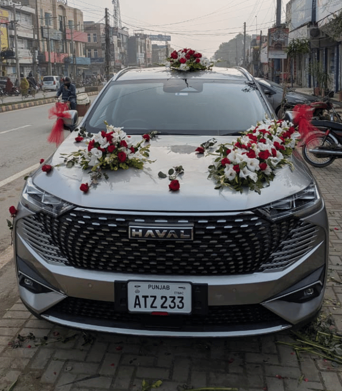 Elegant JAC Car Floral Decor with White Net & Mixed Roses