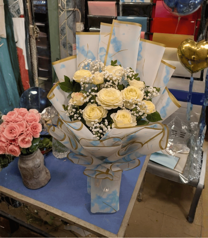White 🤍 Cream Rose Bouquet in Blue Cloud Wrap