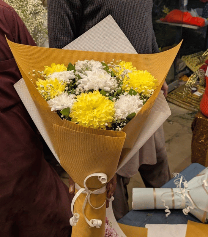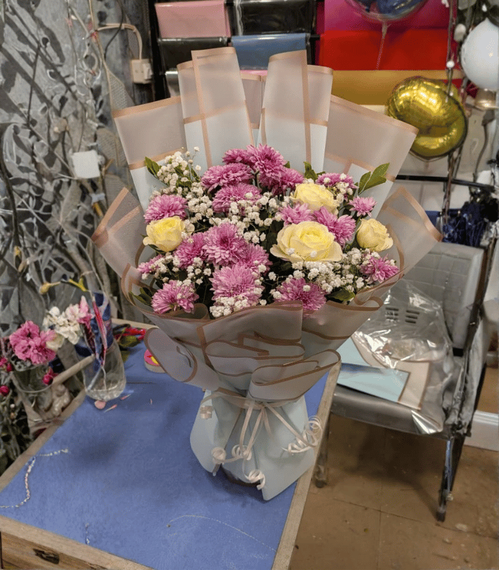 Imported sheet & Pink Chrysanthemum & Yellow Rose Bouquet with Baby’s Breath