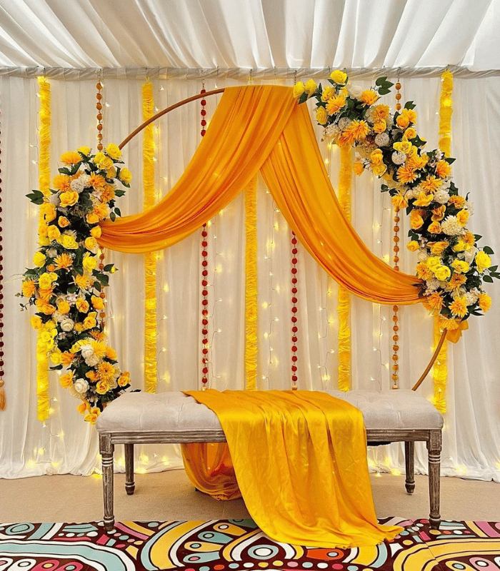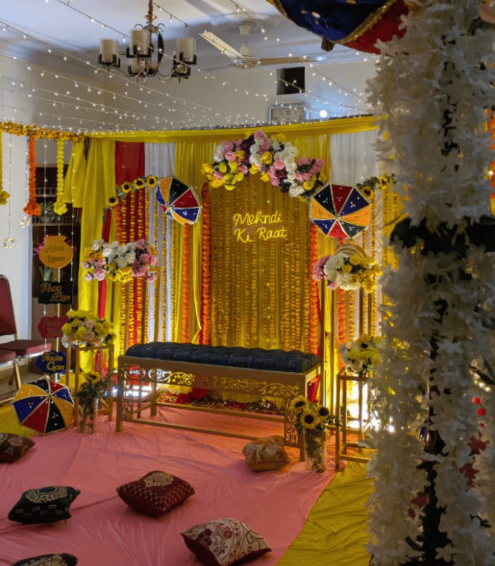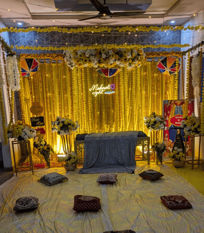 Traditional Yellow & Gold “Mehndi Ki Raat” Home Decor Setup